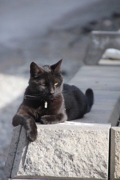 Helt svart hannkatt. Krøller halen over ryggen. Kastrert. Vanligvis kontaktsøkende overfor folk, vil lett følge etter noen.