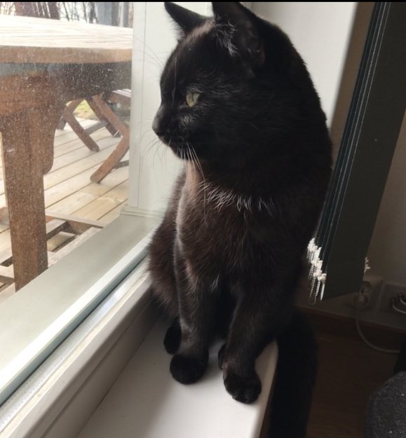 Svart katt. Gule øyne. Ganske liten hannkatt som kan bli oppfattet som kattunge. Han har noen få hvite hår på brystet, og hvis du tar i pelsen kan du se at de aller innerste hårene er grå. Han mjauer og «burrer» mye, og liker å bli klappet på hele seg, til og med på magen. Hvis noen skulle tatt han inn til seg; Han sover ofte på ryggen.
