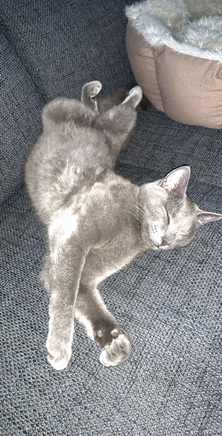 Helt grå pus med veldig myk pels ... er kjælen men liker ikke å bli kost på magen , kun rundt ører/ansikt