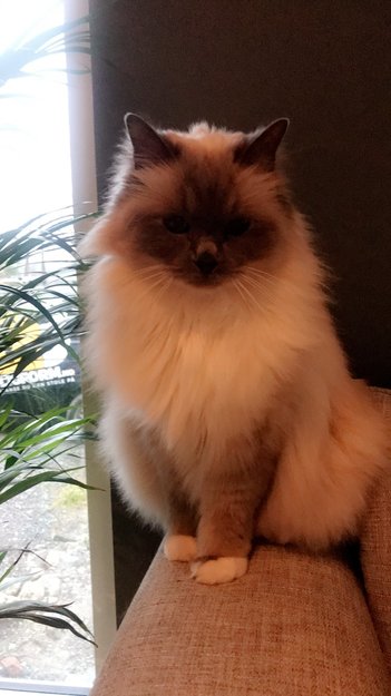 Kremhvit med mørk hale, ansikt, ører og ben. Hvite labber. Blå øyne