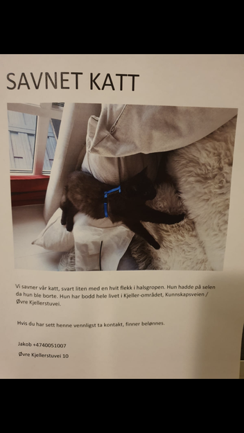 Familien min flyttet nylig fra det gamle huset til en blokk ikke så langt unna. Sara er utekatt, så vi kjøpte sele for å gå tur med henne første ukene. Faren min slapp ut Sara med selen på midt på natta etter tre dager, fordi hun mjauet ved døren. Hun har siden blitt sett verken i det gamle eller nye huset.