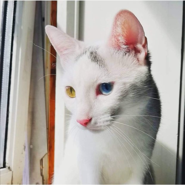 Hvit katt. To grå flekker som minner om øyenbryn. Har et blått og et gult øye. Ikke veldig vennlig med mindre hun vil ha mat.