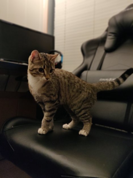 Det er tydelig at katten er vandt til mennesker da den oppsøker oss for kos og sovner i fangene våre. Han er ikke mer enn 6-9 måneder gammel utifra størrelsen på han.