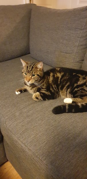 Sto å hylte og grein utføre et hus prøvde å komme seg inn skrapte på alle vinduer. Huseier har aldri sett pusen før. Jeg hentet pus. Sjekket den for chip (ikke chippet) tok den med heim. Fikk mat og vann som den slukte. Så sovnet den etter på.