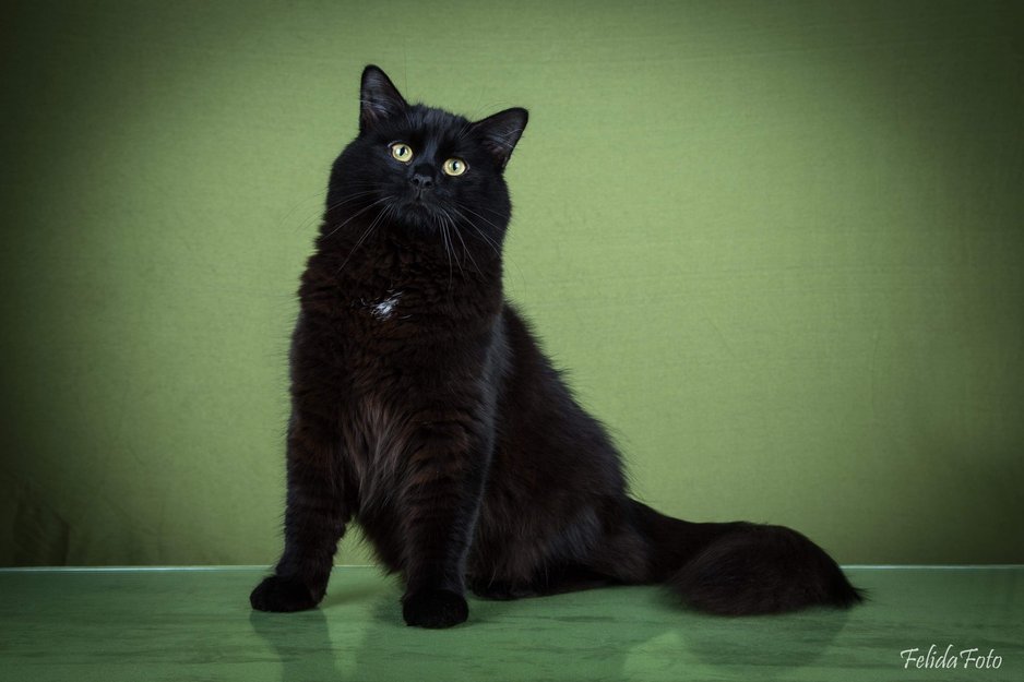 Tino er sort med noe bruntonet innerpels. Han har en liten hvit flekk på brystet og litt hvit pels under alle potene. Han lyder navnet sitt og er veldig rolig og bedagelig.