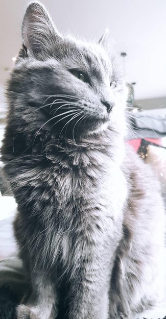 Grå, langhåret hunkatt. ( Mye pels!) 1 år, 4 kg, chippet og sterilisert.