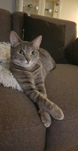 Liten og nett. Ett lite sår som holder på å gro på hodet, over venstre øye, der det mangler pels. Litt forsiktig av seg, pratsom, veldig sosial, kosete og kontaktsøkande. 1 år og 3 måneder gammel. Adoptert fra dyrebeskyttelsen, id. nr. registrert på de.