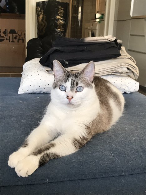 Hon är Vit och brun och har blåa ögon.