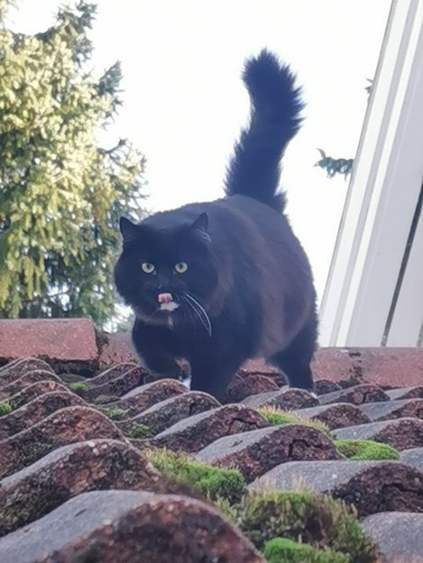 Har hvite værhår på ene siden av snuta og sorte på andre. Noen hvite flekker på. Bryst og labber.