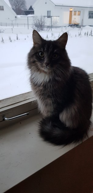 Veldig sky når hun er ute, veldig kosete inne. Ble redd etter flytting og vi får ikke tak i henne. Hun har lurt fellene, men nå dukker hun ikke opp lengre og jeg tror hun har vandret videre