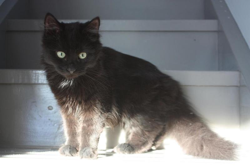 Sort semi-langhår med hvit flekk på bringen og lyse hår ytterst på halen.