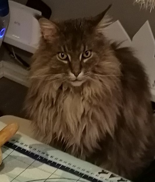 Han er rundt 7kg og lang, markert hvit parti rundt øyne. Litt smalt kjeveparti i forhold til rase. Han har et sort halsbånd med strass steiner.