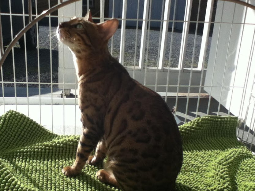 Han er en lang bengalsk katt. Han har en skade i sitt høyre øre.