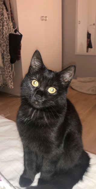 Hun er vel så og si ferdig utvokst, men er ganske liten likevel. Helt svart. Glatt fin pels, veldig sosial.