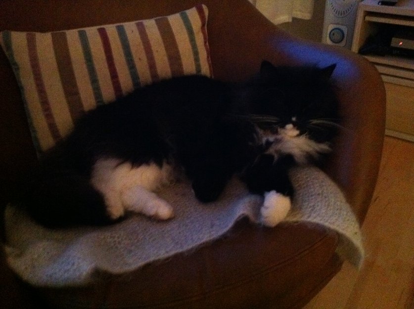 Sort lang pels med hvite poter på forbena og hvite strømper bak. Hvit pels på mage og bryst og en hvit "melkeskvett" på nesa. Bustete sort hale, blått halsbånd med en messing hjerteformet tag.