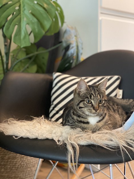 Lissy er tigerstripet med hvit flekk på brystet og en lengre nede på magen.