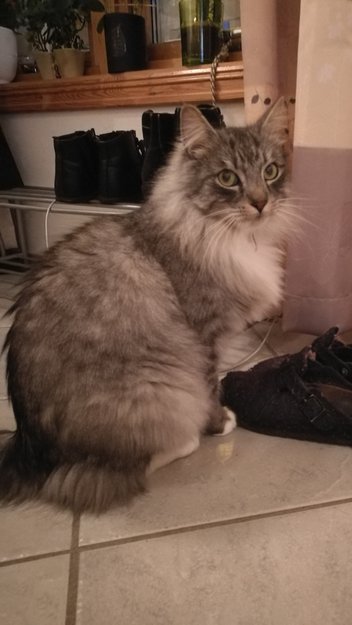 Stor katt på ca.8 kilo. Har gul/grønne øyne