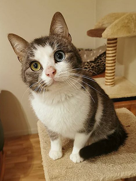 Katten har ulik farve på øynene, noe som bør være et veldig bra kjennetegn. Ett gråblått og ett gult.