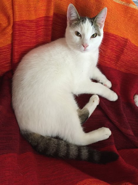 Kroppen er helt hvit. På hodet og venstre bakben har hun store, grå flekker. Halen er sort og grå, stripete.