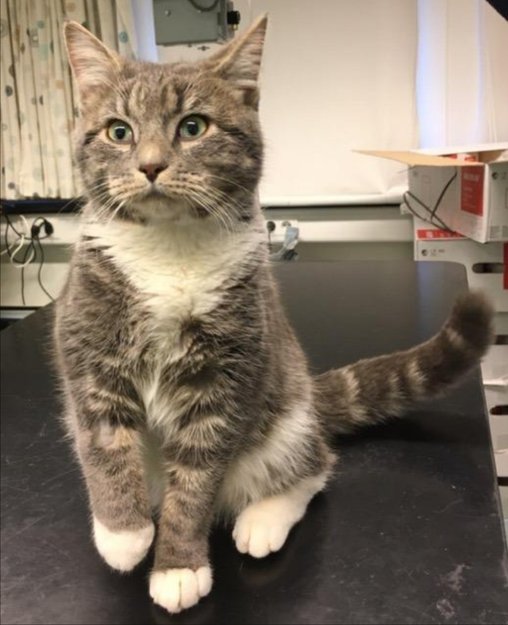 Dukket opp ca 13. Januar hos noen som bor i Gressrudveien. Ble matet 1 uke. Da katten begynte å halte, ble katten levert til Dyrebeskyttelsen.