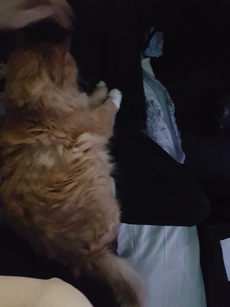 Har ikke bedre bilde. Oransje-ish pels med litt hvit i, hvite labber, har fått ganske mange floker i pelsen over vinteren. Pusur er også ganske gammel.