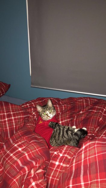 Kattunge nylig operert. Har på seg rød body der det står «evidensia dyreklinikk» på. Hun er en innekatt og klart å stukket av. Hun er grå med sorte striper.