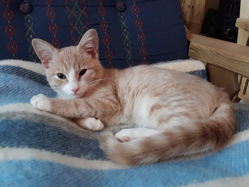 Emil er en slank og liten hankatt på litt over 4 kilo. Pelsen er kort og rødbrannet i en dus oransjefarge. Han er sky.