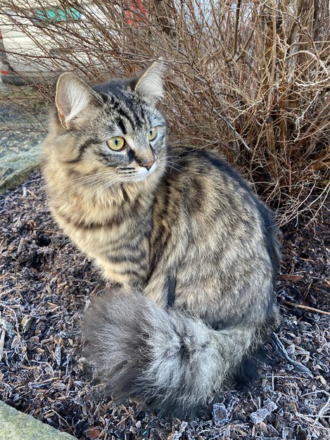 Hun er veldig «fluffy» masse pels. Halen står som regel rett opp og er kjempe fluffy. Ser ut som en vaskekost! Hun er ikke spesielt tykk. Men ser litt større ut pga pelsen.