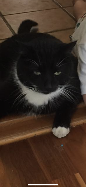 Mest svart, men litt hvit under og på potene. 10 år gammel. Ganske stor katt. Veldig pen.
