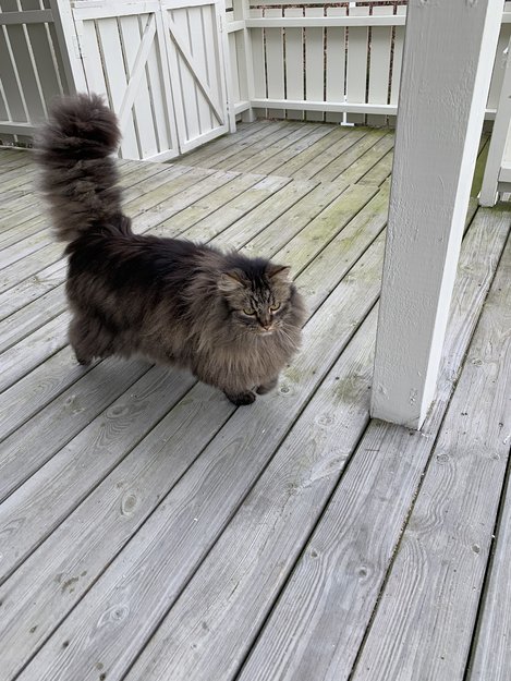 En grå langhåret katt går rundt hytta vår (Tromøy, Arendal) og prøver å komme seg inn. Usikre på om den har noen eiere, men den er ikke merket i øret. Ikke hatt mulighet til å sjekke om den er ID-chippet. Den er flokete i peisen og relativ tynn/slank, Man kan tydelig kjenne ribbeina ved berøring. Utrolig kjelen og tillitsfull.