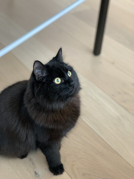 Shira er 10 mnd, helt sort men med brunskjær i noen type lys. Pelsen er halvlang. Hun har rødt halsbånd med refleks.