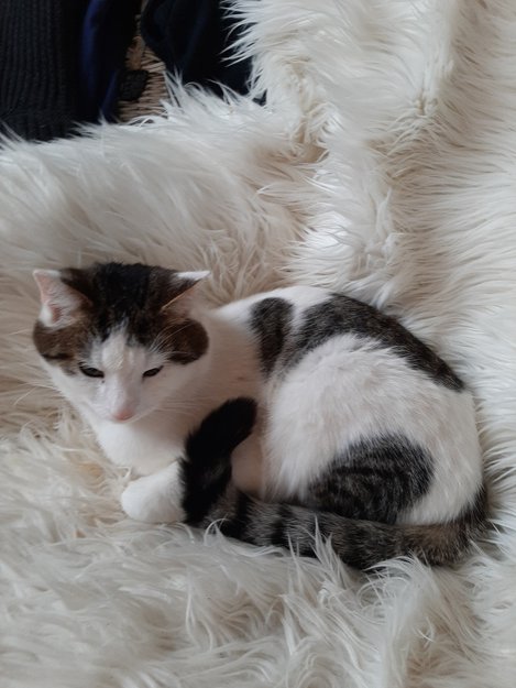 Måtte velge den ene bildet, men han er hvit på den ene siden og grå på den andre. Lett å kjenne igjen fra alle andre katter. Halen og ørene pluss litt av hodet er gråstripete. Stygg skade på høyre fremfot, derav dyrlegebesøk sent en fredag. Veldig tam og tillitsfull, men ikke vært i dyen før. Dette er en bondegutt.