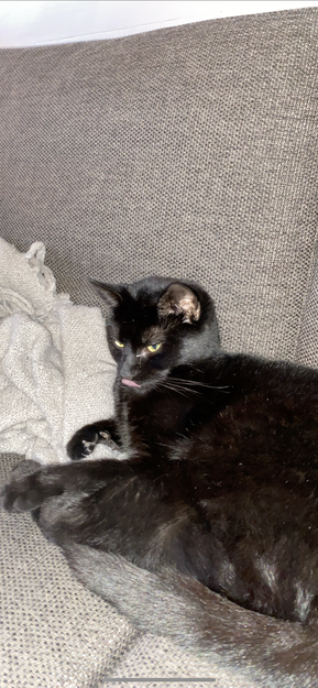 Pepsi er svart, men har også en hvit flekk på buken. Hun er en mellomstor katt som er ca 1.5 år gammel.
