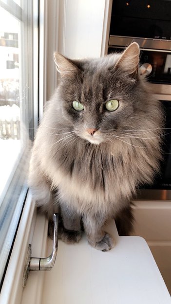 Sofie er en liten, men voksen katt, forsiktig katt, lettskremt, veldig familiekjær. Lett. Buskete hale. Sofie er ID-merket.