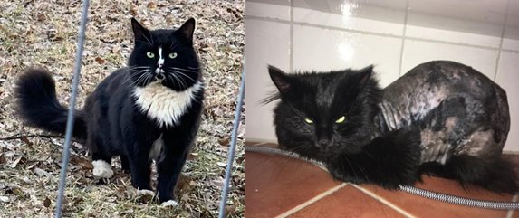 Cosmos er sort og hvit, Choko er nybarbert, helt sort. . Begge er kastrerte, chippet og har øretatovering med ID (Kattene er registrert på Dyrebeskyttelsen Oslo og Akershus)