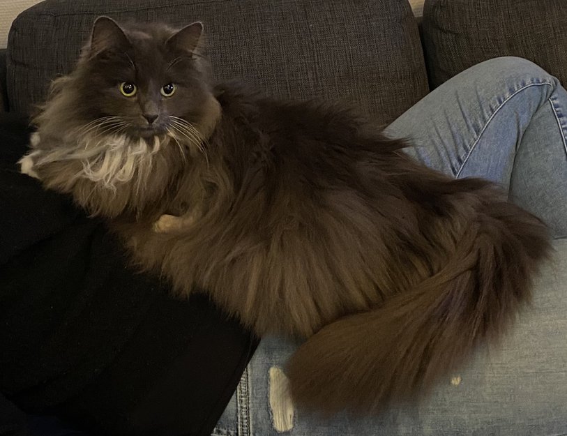 Hun har lang grå pels med hvitt under haken og på potene. Noen floker i pelsen. Rosa halsbånd med navnelapp.