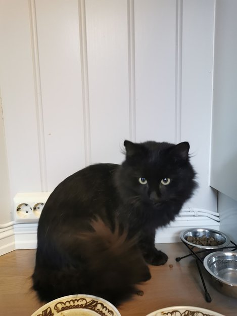 Den er svart, og har gule øyne. Veldig små partier med grå/hvit i pelsen sin
