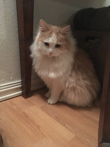 Langhåret hvit og rød. Hun har helt hvit mage, hvit løvemanke og rød og hvit hale.