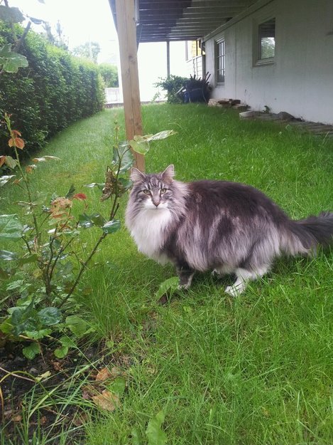 Han er en ganske stor skogkatt på 6år med langt hvit og grått hår.