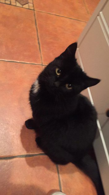 Svart katt med hvit flekk på halsen på nedsiden av haken