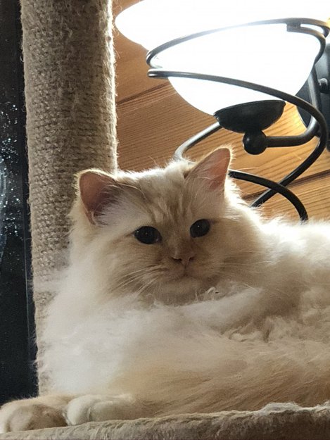 Han er chippet, kastrert og veldig kosete. Han er rød Hellig Birma med knall blå øyne og rosa halsbånd. Chippen er registrert på Johanne A. Johansen.