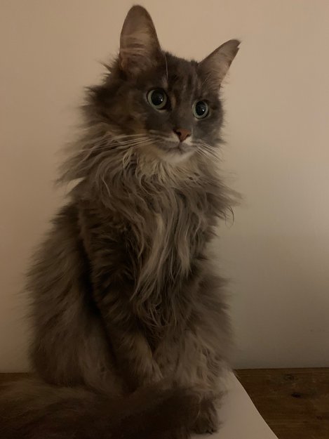 Liten hunkatt. Langhåret grå pels. Hvit under halsen. Et lite hakk øverst i venstre øre. ID tatovering inne i samme øre. Hun er chippet.