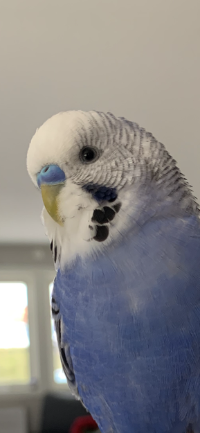 Han er en hvit,blå og svart gutt. Blå over nebbet.