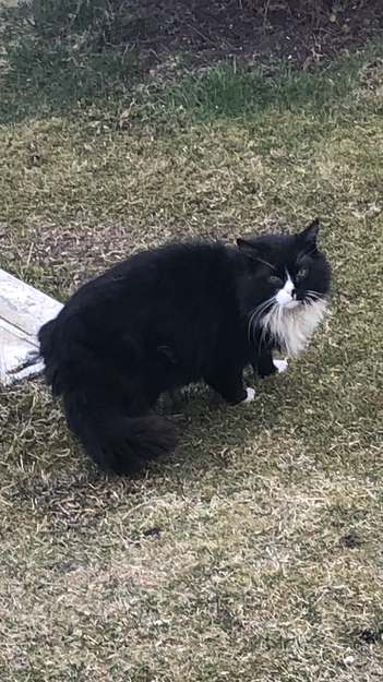Denne katten har jeg sett noen få ganger rundt vårt hus i en 2 års periode. Skjønte fort at den har gått seg vill, for er fryktelig redd, er ganske ustelt i pelsen og har møkkete, hvite labber. Leter etter mat hos oss rundt «fugletreet», og den er veldig sulten. Mater den når jeg ser den, men det er dessverre sjeldent. Noen som kjenner den igjen? Har også hvite baklabber.
