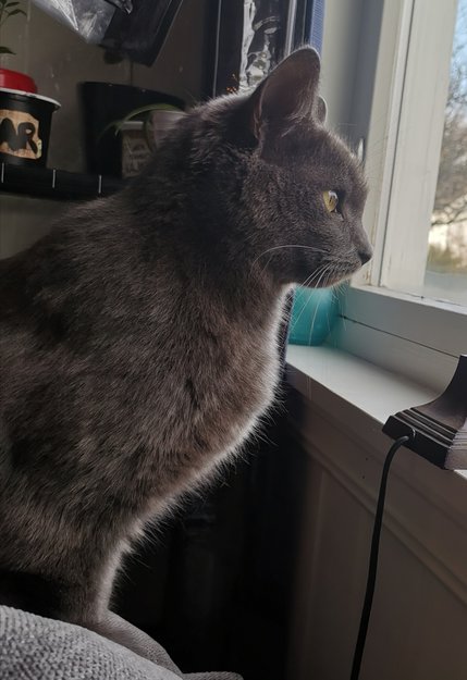 Han hadde på seg et blått halsbånd da han gikk ut, mulig han har mistet dette nå.