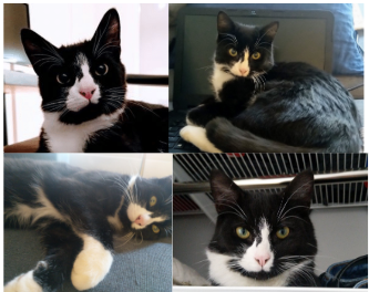 Svart og hvit katt med usymetrisk hvitt mønster på snuten. Ca. seks måneder gammel.