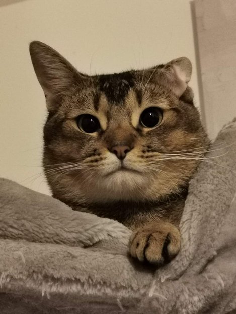 Han har et ødelagt venstre øre på grunn av hematom. Han er ganske liten i størrelse og stoler litt for mye på mennesker.