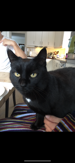 Sort, korthåret katt med hvit prikk på brystet og en enda mindre hvit flekk under magen.