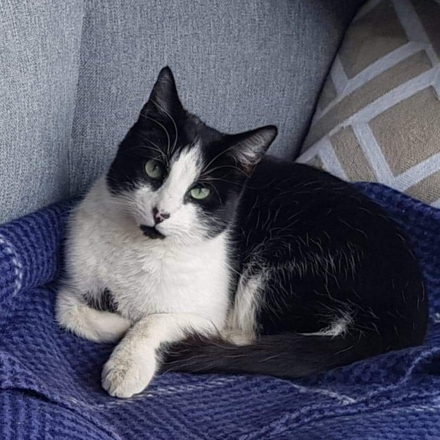 Tito har laaaang hale, og sort hake. Han er korthåret svart og hvit. Veldig sosial katt.