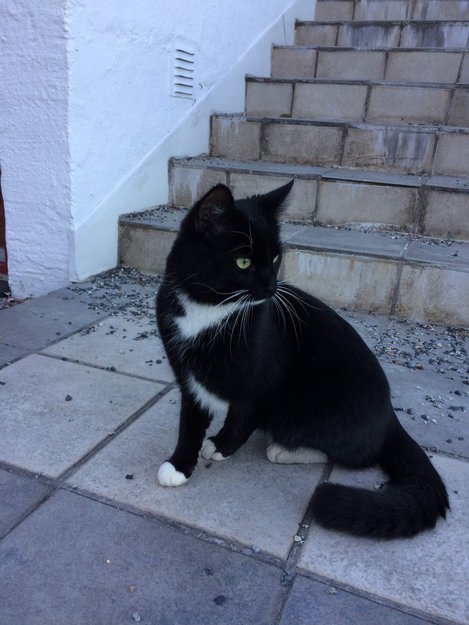 Svart katt med hvite labber. Hvit på haken och på magen.